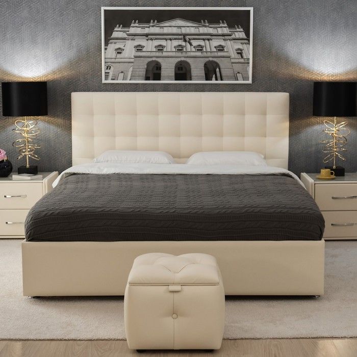 Двуспальная кровать выполнена в трёх стандартных размерах: 140 х 200 см, 160 х 200 см и 180 х 200 см. Стоит на ножках высотой 50 мм.