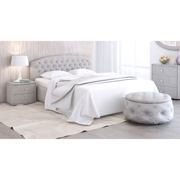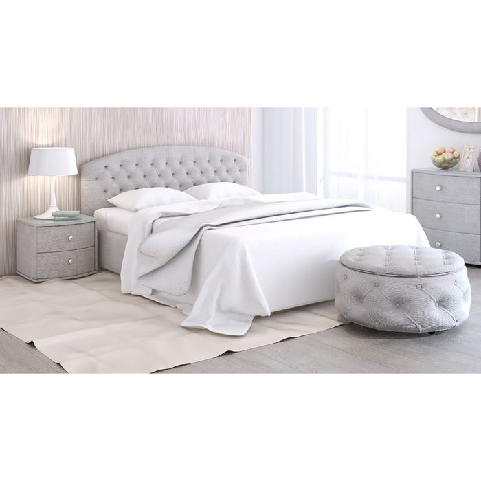 Двуспальная кровать выполнена в трёх стандартных размерах: 140 х 200 см, 160 х 200 см и 180 х 200 см. Стоит на ножках высотой 50 мм.