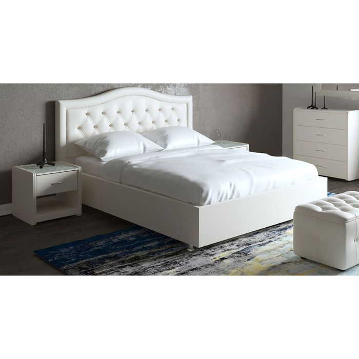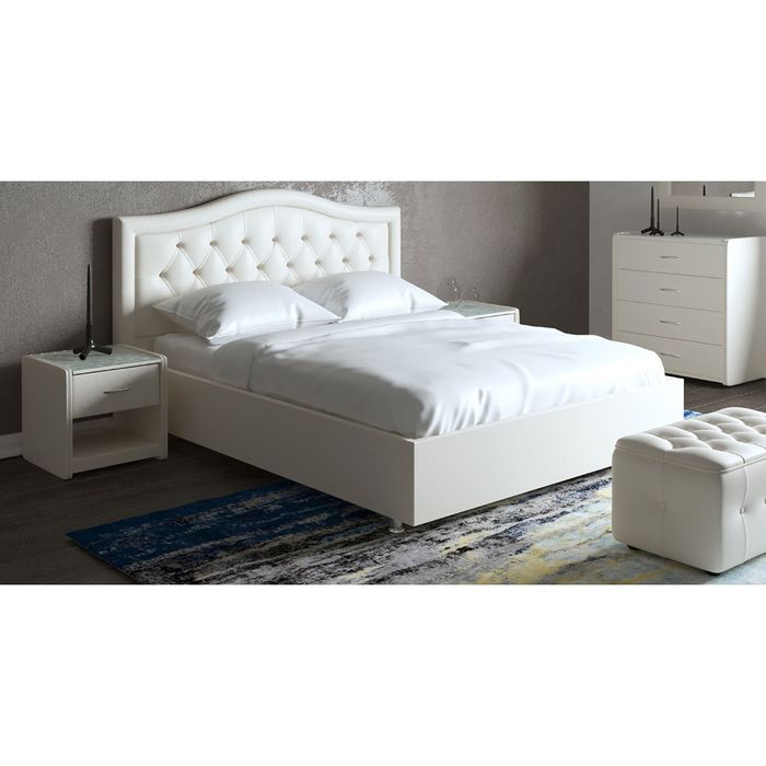 Двуспальная кровать выполнена в трёх стандартных размерах: 140 х 200 см, 160 х 200 см и 180 х 200 см. Стоит на ножках высотой 50 мм.