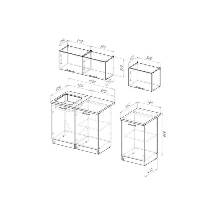 - Навесные шкафы (Ш x Г x В): 500 x 300 x 360 мм, 3 шт.