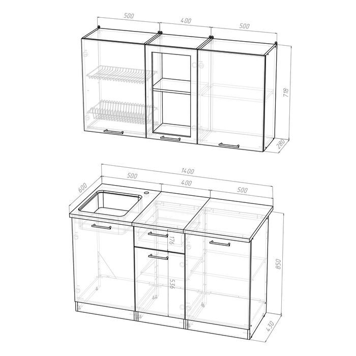 К данному кухонному гарнитуру подойдёт решётка посудосушителя шириной 500 мм.