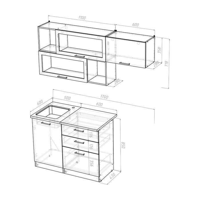 Кухонная мойка, стеновая панель, решётка для посудосушителя в комплект не входят.