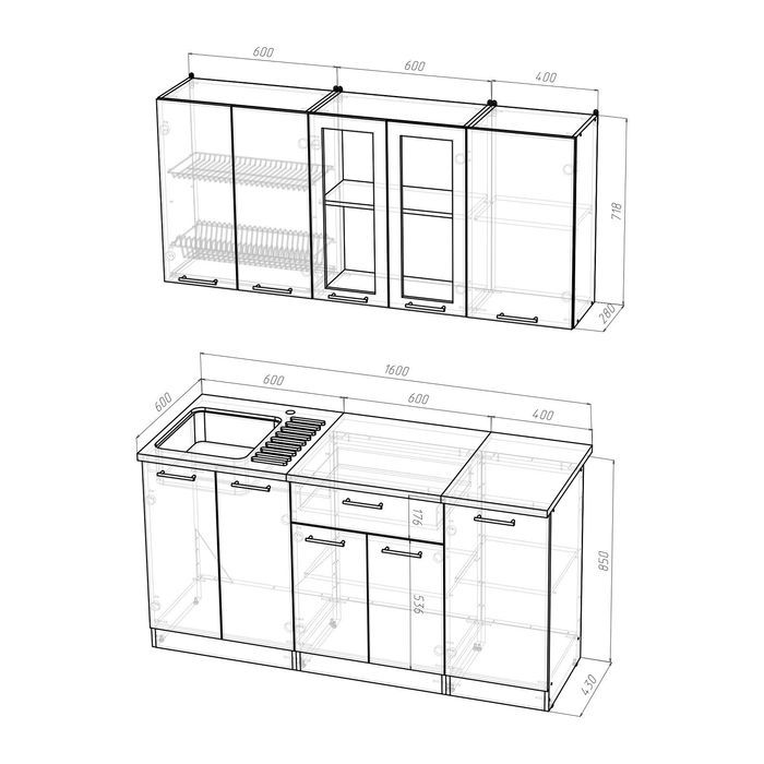 К данному кухонному гарнитуру подойдёт решётка посудосушителя шириной 600 мм.