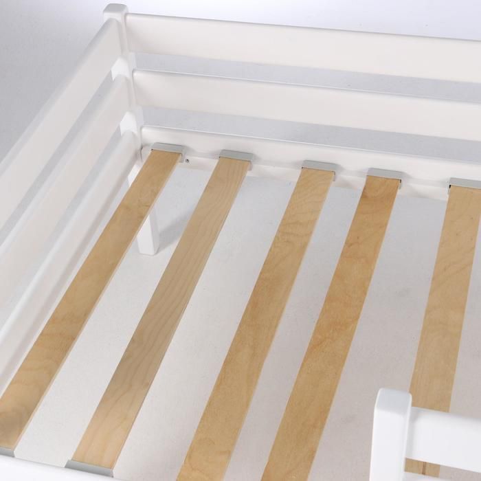 Каркас изготовлен из массива березы и покрыт безопасной полиуретановой краской на водной основе, не имеет посторонних запахов. Безопасна к использованию детской мебели. Основанием для матраса служат горизонтальные рейки из фанеры, дополнительно сверху укладывается древесно-волокнистая плита (ДВП).