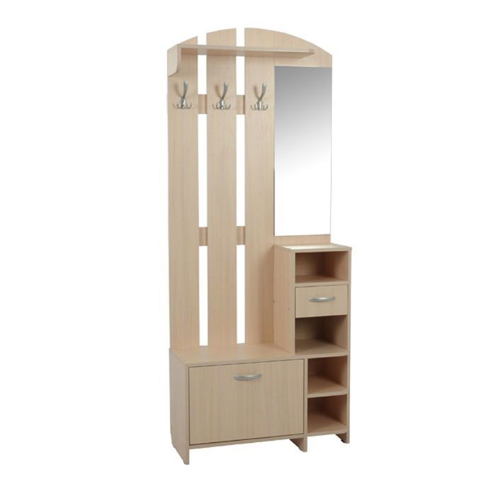 В прихожей «Мила» есть всё необходимое для хранения обуви и демисезонной одежды. Куртки, плащи, шубы и сумки вы сможете повесить на металлические крючки. Шляпки и другие головные уборы — положить на полку сверху, нужные мелочи — разместить в выдвижном ящике. На открытых нишах можно расположить зонты, перчатки и шарфы.