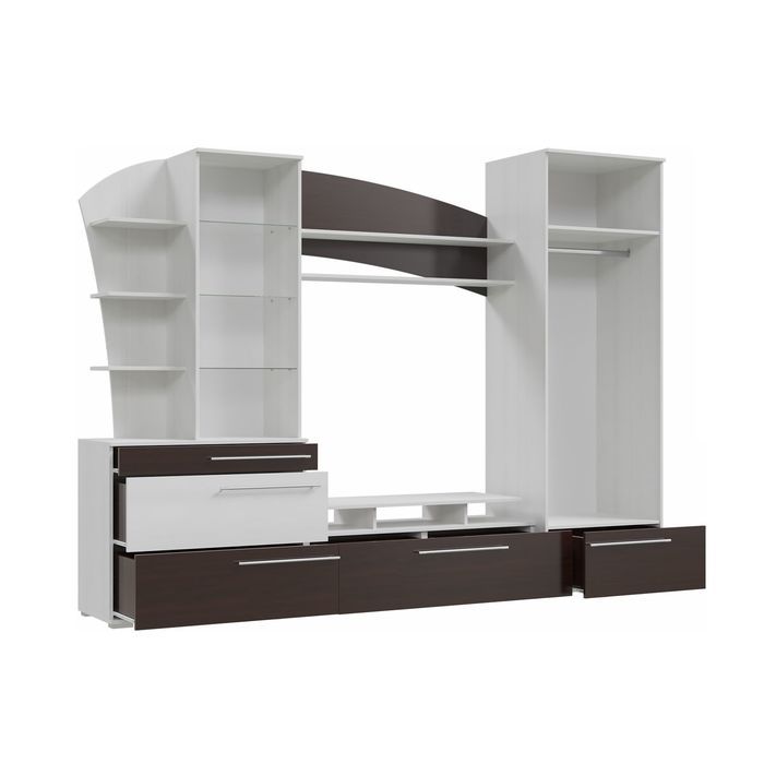 Гостиная «Глория» состоит из блока с пятью выкатными ящиками на роликовых направляющих, распашного платяного шкафа со штангой и антресолью. Под нишей для телевизора имеются открытые полки, на которых удобно хранить диски. На верхние открытые полки поставьте книги, сувениры или цветы. Слева имеются два блока с полками: открытый и со стеклянной дверкой. Рекомендуем разместить в нём чайный сервиз или памятные сувениры.