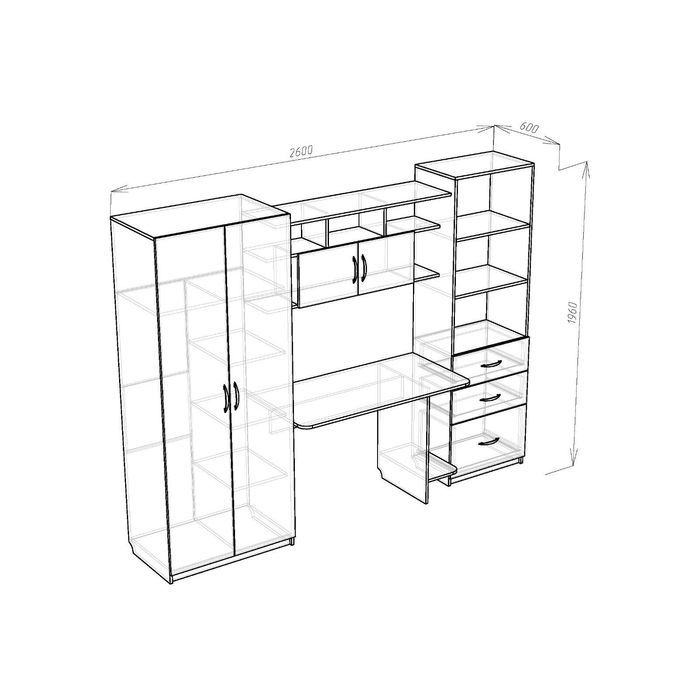 Данная стенка поможет организовать пространство для хранения вещей ребёнка. Она компактная и не займёт много места в квартире. Модель оснащена шкафом, нишами, выдвижными и распашными ящиками, а также закрытыми полками. Храните там одежду, гаджеты, книги, а также тетради и прочую канцелярию. В комплект изделия входит стол, на котором можно расположить компьютер и заниматься уроками.
