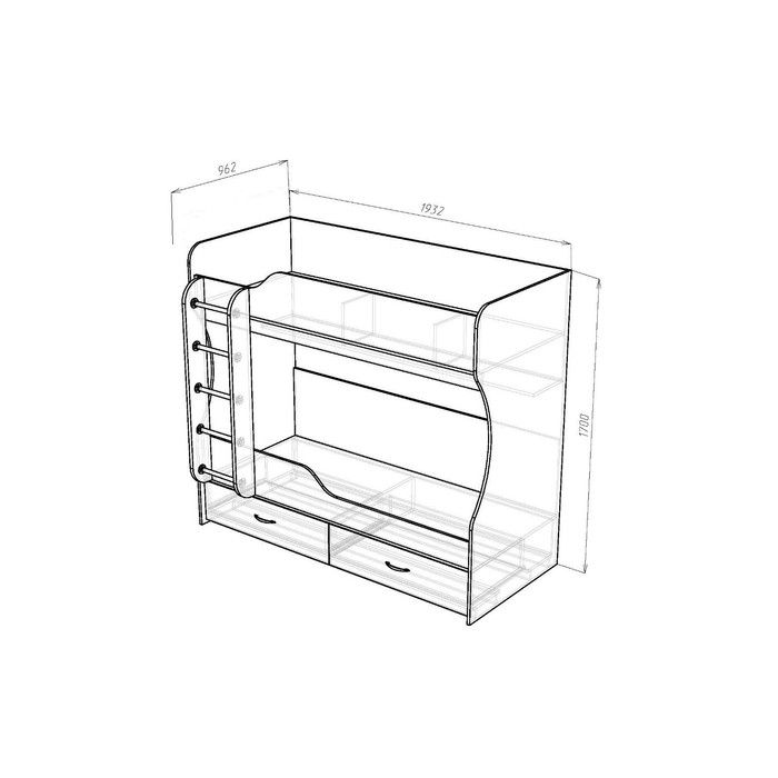 Размер спального места составляет 80 x 190 см (Ш x Д). Максимально допустимая нагрузка на первый ярус — 90 кг, на второй — 45 кг. Основание кровати — настил из ЛДСП. Обратите внимание: матрасы в комплект не входят.