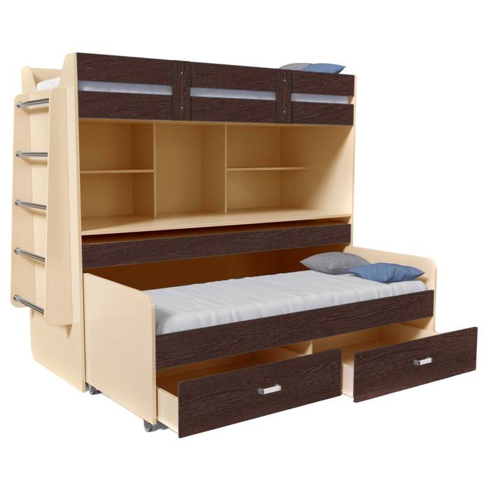 Эта двухъярусная кровать — настоящая находка для небольших комнат. Выдвижная столешница на усиленных направляющих полного выдвижения формирует большой полноценный учебный стол для двоих детей, при этом все учебники и письменные принадлежности остаются на полках.