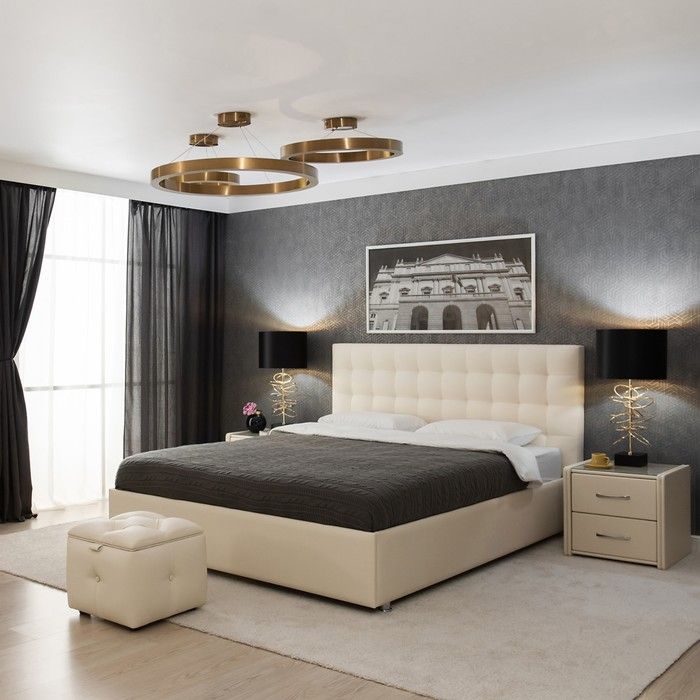 Двуспальная кровать выполнена в трёх стандартных размерах: 140 х 200 см, 160 х 200 см и 180 х 200 см. Стоит на ножках высотой 50 мм.