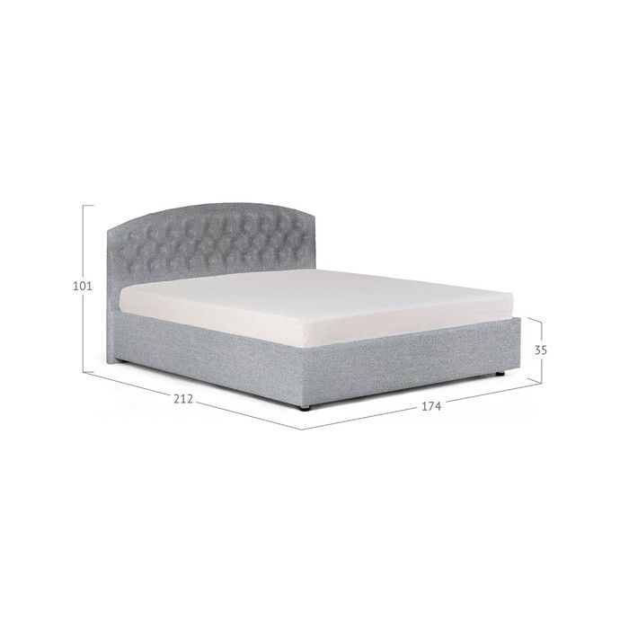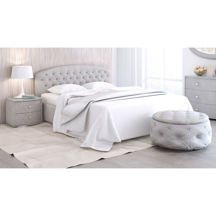 Двуспальная кровать выполнена в трёх стандартных размерах: 140 х 200 см, 160 х 200 см и 180 х 200 см. Стоит на ножках высотой 50 мм.