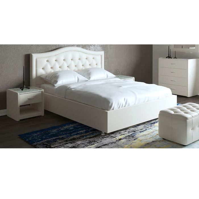 Двуспальная кровать выполнена в трёх стандартных размерах: 140 х 200 см, 160 х 200 см и 180 х 200 см. Стоит на ножках высотой 50 мм.