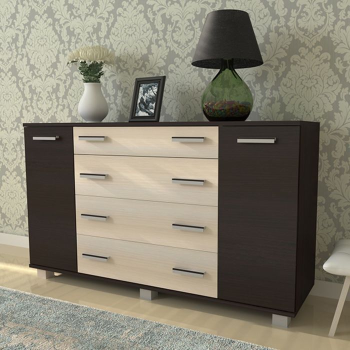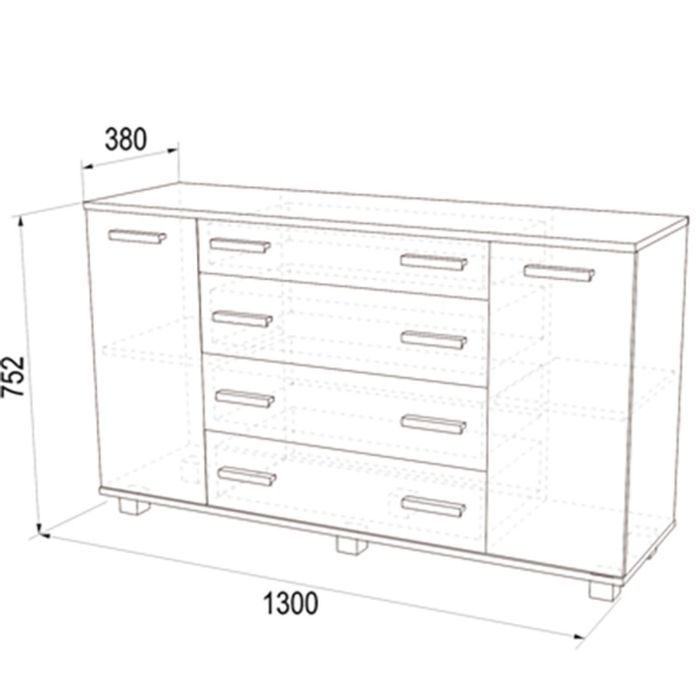 Ящики комода оснащены телескопическими направляющими, отличающимися компактностью, механической жёсткостью и незначительным прогибом даже в полностью выдвинутом состоянии. Регулируемые опоры обеспечат устойчивость комода на неровных полах. Ручки изготовлены из пластика.