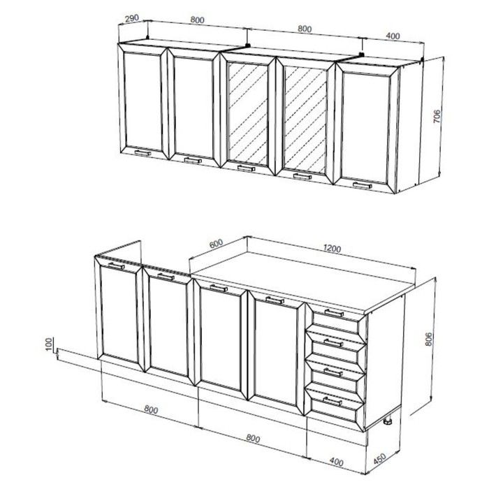 - Шкаф под мойку (Ш x В x Г): 800 x 810 x 450 мм.