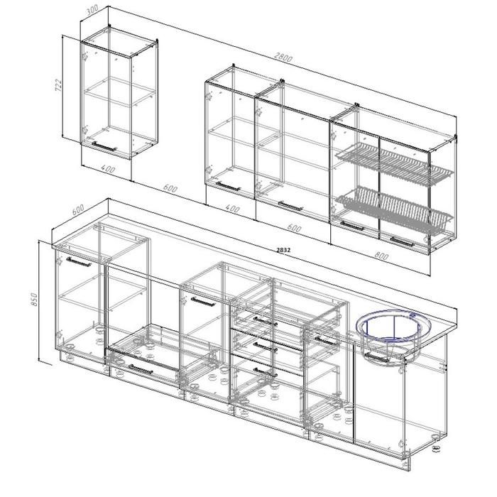 - Глубина верхних модулей: 300 мм.