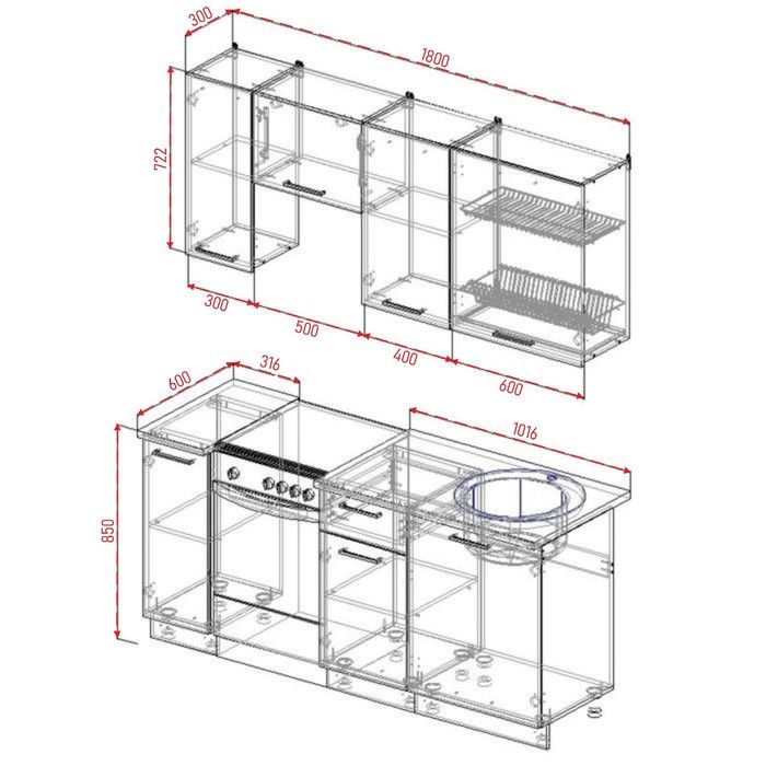 - Глубина верхних модулей: 300 мм.
