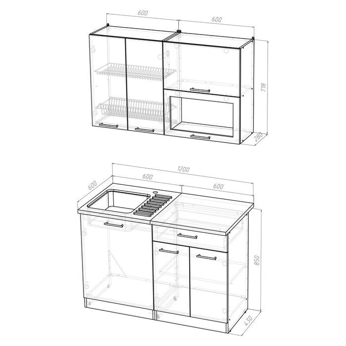 К данному кухонному гарнитуру подойдёт решётка посудосушителя шириной 600 мм.