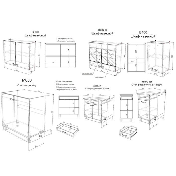 - Шкаф под мойку (Ш х В х Г): 800 х 840 х 450 мм.