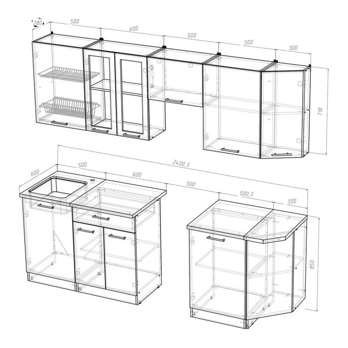 К данному кухонному гарнитуру подойдёт решётка посудосушителя шириной 500 мм.