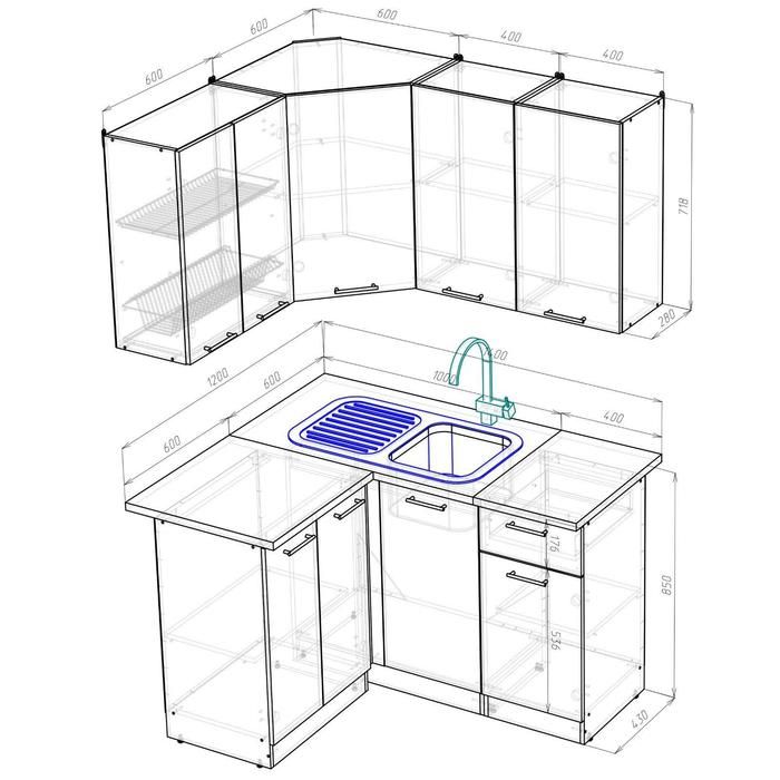 - Кухонная мойка, стеновая панель, посудосушитель в комплект не входят.
