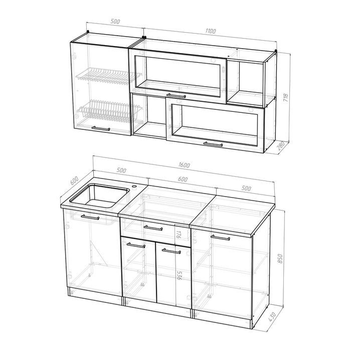 К данному кухонному гарнитуру подойдёт решётка посудосушителя шириной 500 мм.