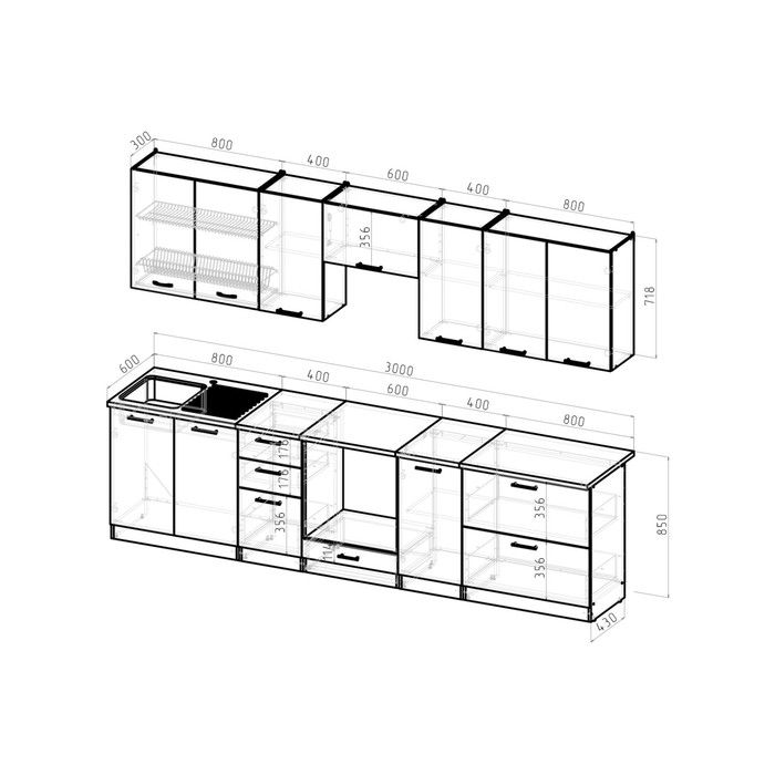 Мойка, смеситель, посудосушитель и бытовая техника в комплект не входят.