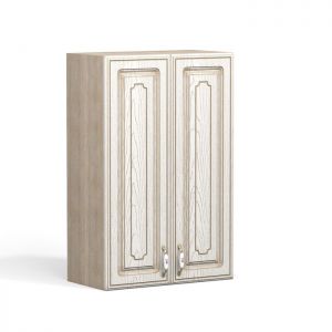 Фасады кухни выполнены из фрезерованной МДФ, покрыты пленкой ПВХ, патина нанесена вручную и защищена сверху матовым итальянским лаком.