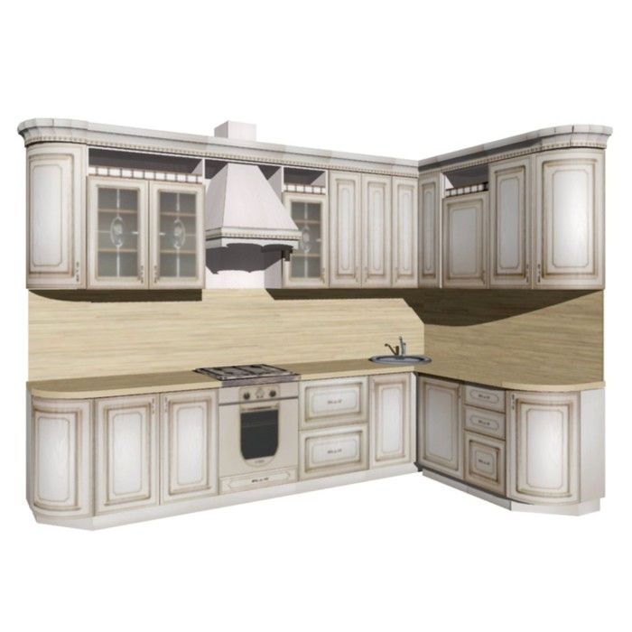 Фасады кухни выполнены из фрезерованной МДФ, покрыты пленкой ПВХ, патина нанесена вручную и защищена сверху матовым итальянским лаком.