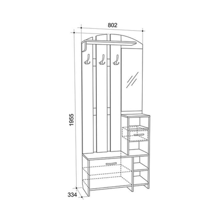 Прихожая — это небольшая комната, которая является лицом всей квартиры. Здесь мы встречаем и провожаем гостей, собираемся на работу. Многофункциональный и стильный модуль не займёт много места, при этом в нём есть все необходимые элементы: вешалка с крючками для одежды и сумок, обувница, полки, зеркало. Сборка универсальная.