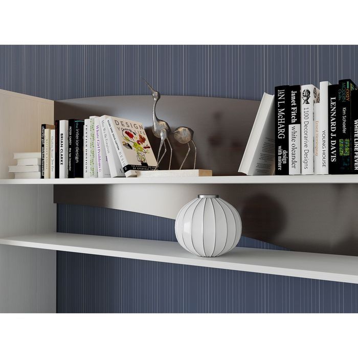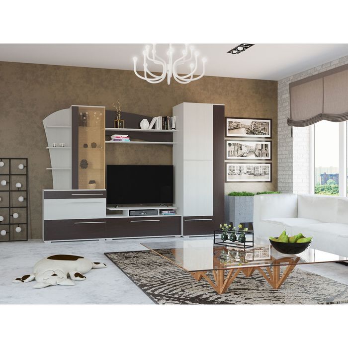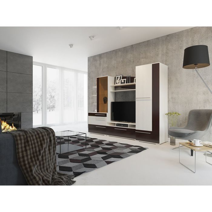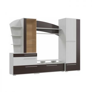 Гостиная «Глория» состоит из блока с пятью выкатными ящиками на роликовых направляющих, распашного платяного шкафа со штангой и антресолью. Под нишей для телевизора имеются открытые полки, на которых удобно хранить диски. На верхние открытые полки поставьте книги, сувениры или цветы. Слева имеются два блока с полками: открытый и со стеклянной дверкой. Рекомендуем разместить в нём чайный сервиз или памятные сувениры.