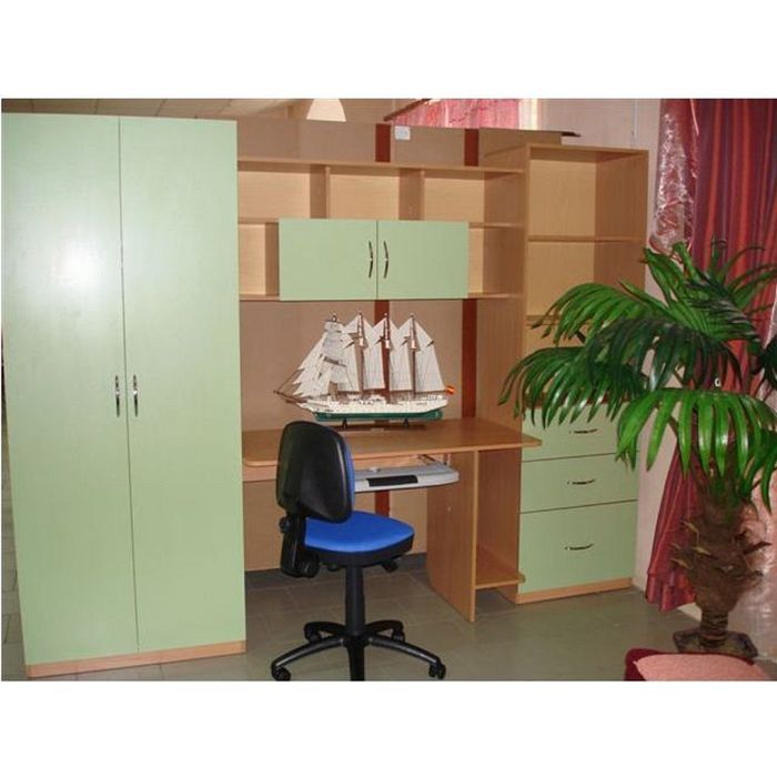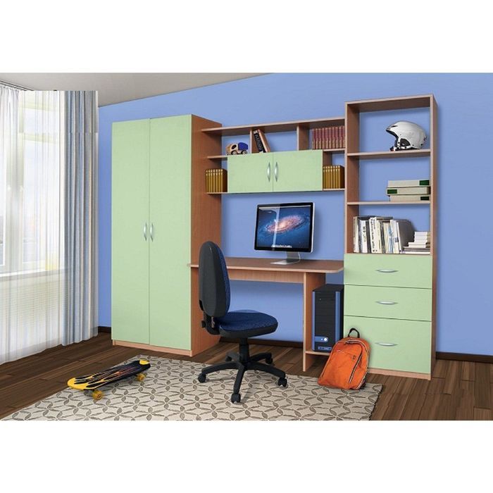 Данная стенка поможет организовать пространство для хранения вещей ребёнка. Она компактная и не займёт много места в квартире. Модель оснащена шкафом, нишами, выдвижными и распашными ящиками, а также закрытыми полками. Храните там одежду, гаджеты, книги, а также тетради и прочую канцелярию. В комплект изделия входит стол, на котором можно расположить компьютер и заниматься уроками.